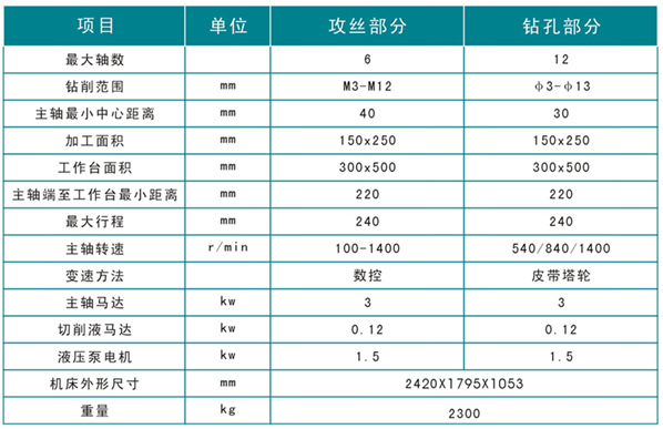 QK5413*12鉆攻兩用組合機(jī)床,在ZK5213系列產(chǎn)品上增加多軸攻絲機(jī)床,采用全自動PLC控制,光柵尺和伺服電機(jī)精密控制進(jìn)給深度,操作界面簡單易用。采用深孔加工程序,實(shí)現(xiàn)多段進(jìn)給多次排屑。